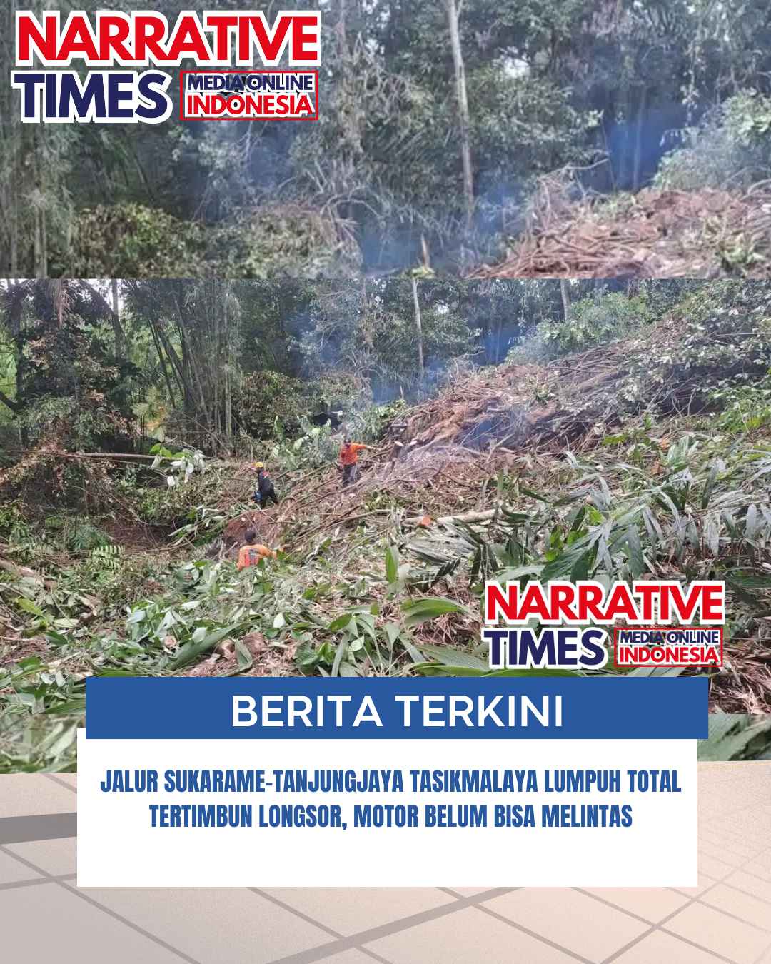 ww.narrativetimes.com.ǁJawa Barat,23 Februari 2026-Akses jalan alternatif penghubung Kecamatan Sukarame dan Tanjungjaya Kabupaten Tasikmalaya belum bisa dilintasi, akibat tertimbun longsor.